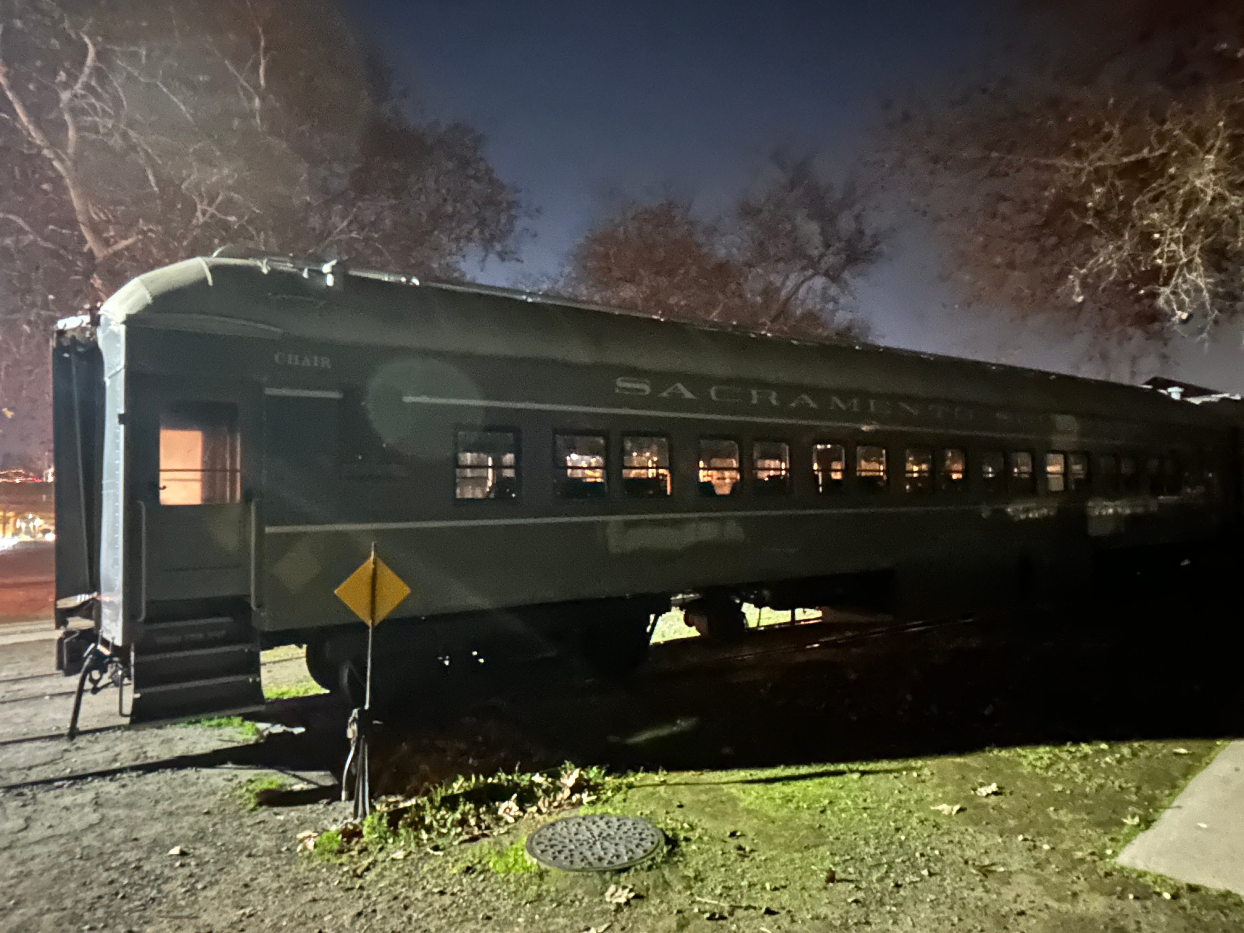 While I can’t wait to get back to Portland someday, I can’t confidently say the same about Sac-town. I had booked a room at a Comfort Inn off the interstate, just a bit down the street from a Best Western, and across the street from a Motel 6, right next to a Quality Inn, and adjacent to an encampment of unhoused people and dogs by the Sacramento Riverfront. To say this area was on the wrong side of the tracks would be an accurate description. As I walked to the arena down a poorly lit bike path, I passed several abandoned train cars like this one.