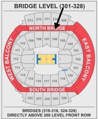 I sat in the Bridge level for the previous home game, when the Houston Rockets came to town. After sitting on the South Bridge for the last home game, I found us tickets on the North Bridge for this one. This part of the Bridge was closer to center court and didn’t have the built-in table/monitor at our seats, unlike some other Bridge seats. Still, sitting in the second row of the Bridge gave us the option to stand up without blocking anyone else’s view, which, for me, is a plus.