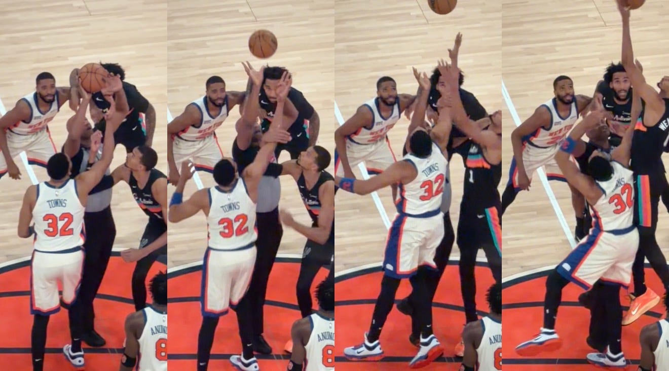 To start the game, Victor Wembanyama won the tip, but look closely at the photo above as Wemby employs a little sneaky move, holding down Karl-Anthony Towns’ right arm with his right hand as he elevated for the ball. No foul was called.