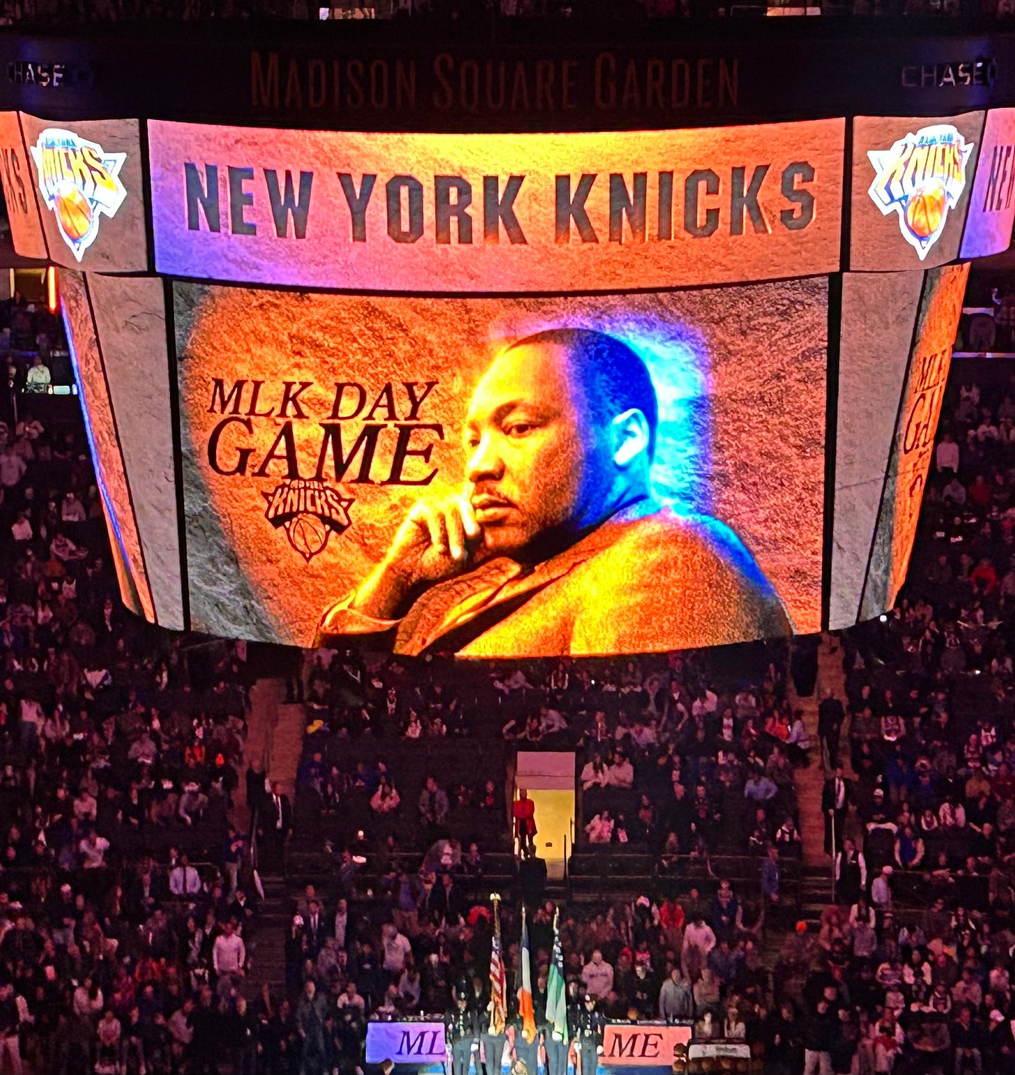 Between each quarter, the Knicks would highlight a different quote from Martin Luther King Jr. on the massive Garden Vision scoreboard high above center court. Between the third and fourth quarters, the quote was: